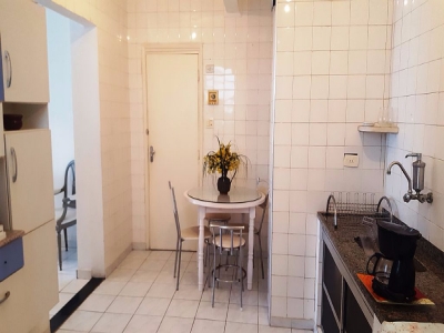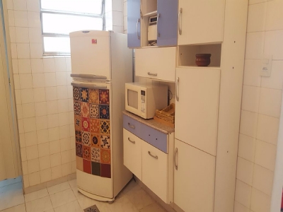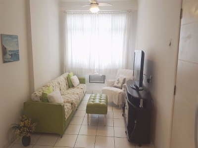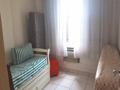 O apartamento todo mobiliado com piso frio; possui dois dormitórios, ar condicionado na sala de visita e em um dos dormitórios e ventilador,, banheiro, cozinha grande, área de serviço.