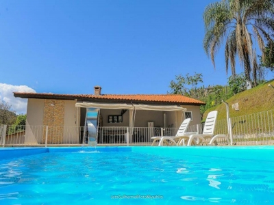 Sítio com 4 quartos, 2 banheiros e acomodações para até 15 pessoas.